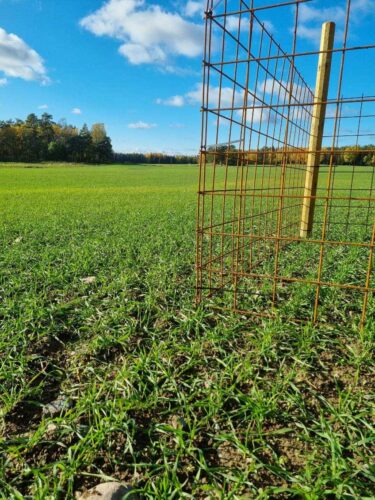 Efter att de allra flesta medverkande gårdar blivit klara med höstsådden har försökspatrullen gjort ett strålande jobb med att sätta upp burarna. Några burar återstår att sättas upp, något som planeras ske inom en snar framtid. Nytt för denna omgång är att varje försök har fyra fält i stället för tre. Detta för att vi forskningsmässigt ska kunna jämföra fler olika skrämselmetoder.