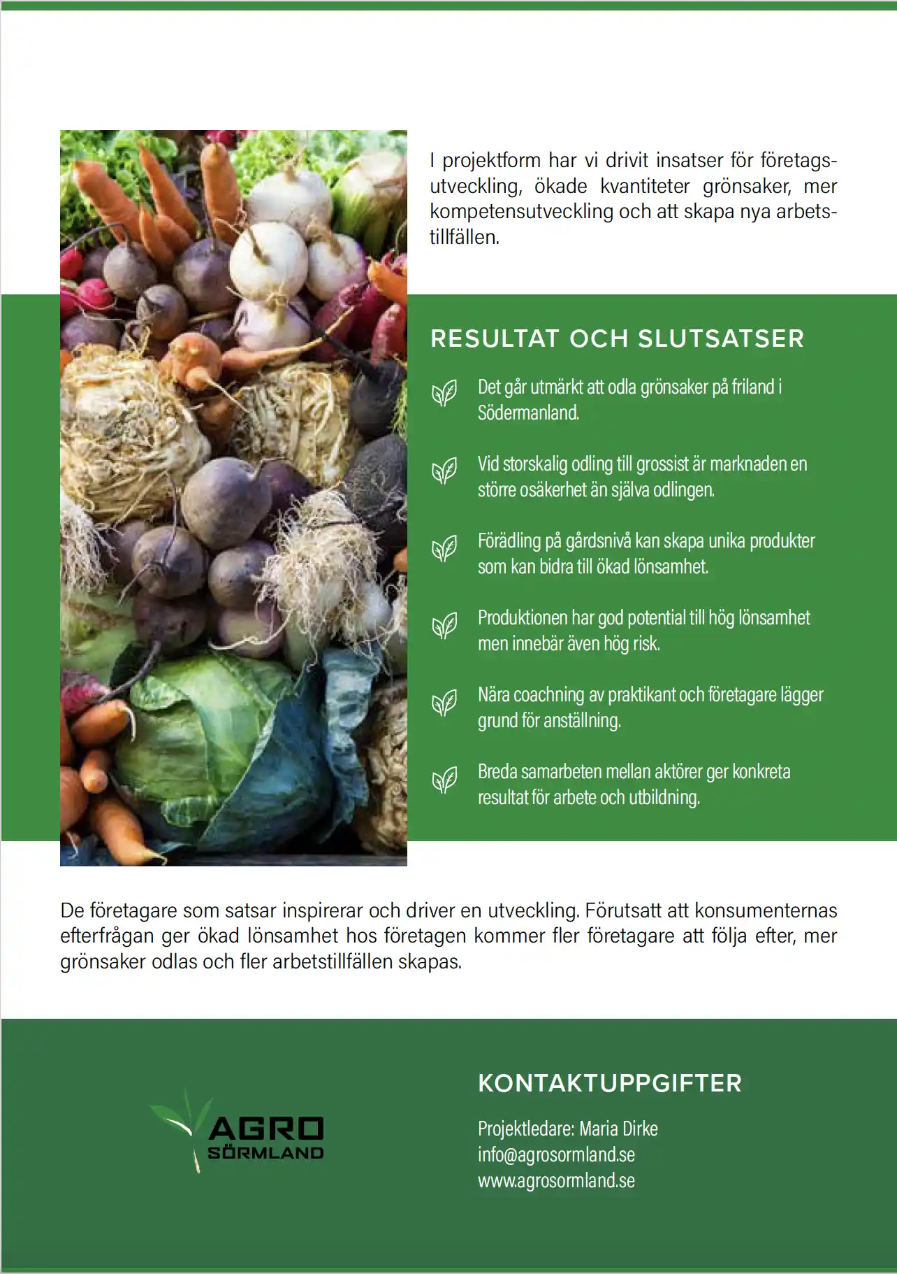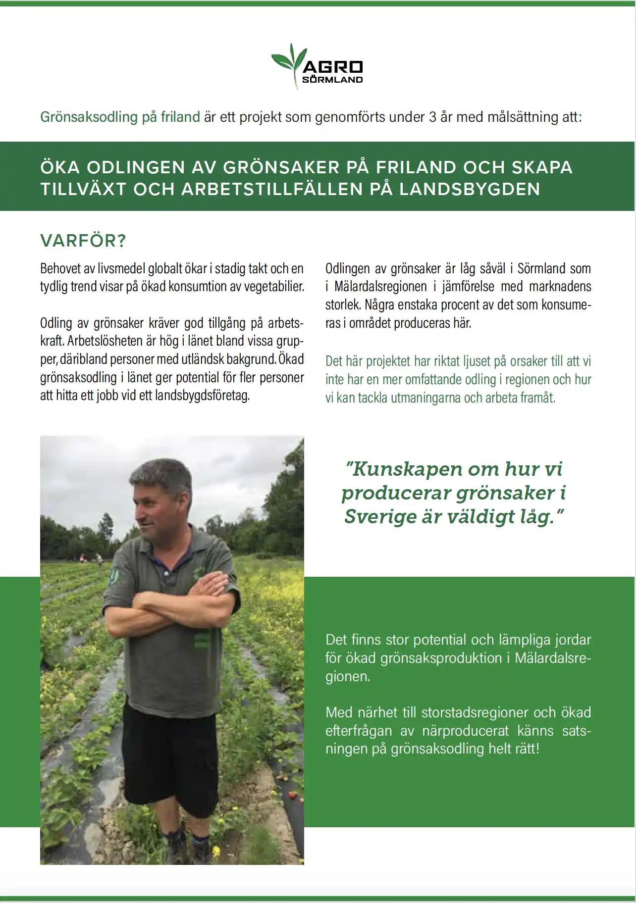 Grönsaksodling på friland – ett bidrag till angelägna samhällsutmaningar är ett Leader-projekt som Agro Sörmland drivit under 3 års tid. Odlingen av grönsaker i Sörmland är liten, i synnerhet i förhållande till marknadens storlek i Mälardalen och Stockholmsområdet. Men: det går alldeles utmärkt att odla grönsaker på friland i Sörmland! Orsakerna till varför vi inte har större odling är flera och de har vi borrat i lite extra under projektarbetets gång. De stora utmaningarna med lönsamhet i produktionen, såväl inom frilandsodling av grönsaker som i många andra delar av livsmedelsproduktionen just nu begränsar självklart omfattningen. I Sverige är mycket av grönsaksodlingen koncentrerad till södra Sverige med stora företag och samverkan inom ett fåtal marknadskanaler. Men det är inte enbart där odlingen finns, den finns även i Östergötland, Västra Götaland, på Gotland med mera. Och skulle kunna finnas i större omfattning även här.