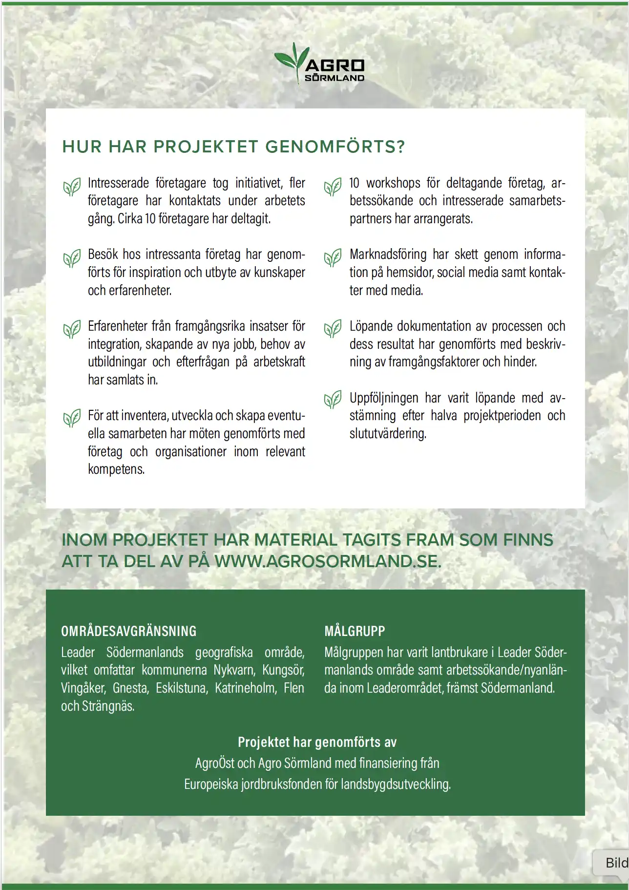 För att ta del av mer bakom ovanstående punkter läs vidare i projektets delrapporter om: Sammanfattning av projektarbetet, resultat och lärdomar Företagsmässiga förutsättningar, Lovang Lantbruk AB Beskrivning över hur gå tillväga för att förädla grönsaker på gårdsnivå, Profox Framgångsfaktorer vid matchning av arbetssökande och landsbygdsföretagare.